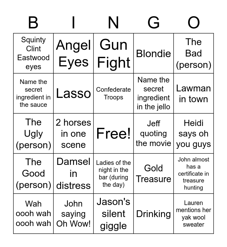 This bingo card has a free space and 29 words: Wah oooh wah oooh wah, Tip the hat, 2 horses in one scene, Tumbleweeds, Squinty Clint Eastwood eyes, Gun Fight, Lasso, Damsel in distress, Jeff quoting the movie, John saying Oh Wow!, Heidi says oh you guys, Lauren mentions her yak wool sweater, Jason's silent giggle, Drinking, Lawman in town, Shot off a horse, Ladies of the night in the bar (during the day), The Good (person), The Bad (person), The Ugly (person), Gold Treasure, Run away horse drawn ambulance, Name the secret ingredient in the jello, Name the secret ingredient in the sauce, Blondie, Angel Eyes, John almost has a certificate in treasure hunting, Confederate Troops and Union Troops.
