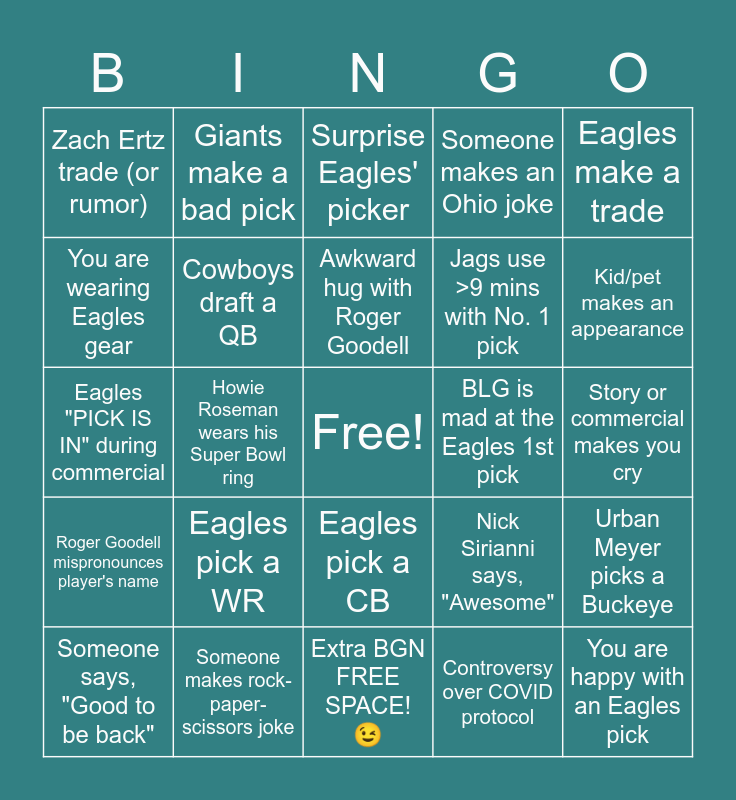This bingo card has a free space and 24 words: Eagles pick a WR, Someone makes rock-paper-scissors joke, Awkward hug with Roger Goodell, Someone says, "Good to be back", Eagles make a trade, Zach Ertz trade (or rumor), You are wearing Eagles gear, Giants make a bad pick, BLG is mad at the Eagles 1st pick, Eagles pick a CB, Jags use >9 mins with No. 1 pick, Eagles "PICK IS IN" during commercial, Nick Sirianni says, "Awesome", Urban Meyer picks a Buckeye, Cowboys draft a QB, Controversy over COVID protocol, Story or commercial makes you cry, Surprise Eagles' picker, Kid/pet makes an appearance, Howie Roseman wears his Super Bowl ring, You are happy with an Eagles pick, Roger Goodell mispronounces player's name, Someone makes an Ohio joke and Extra BGN FREE SPACE! 😉.