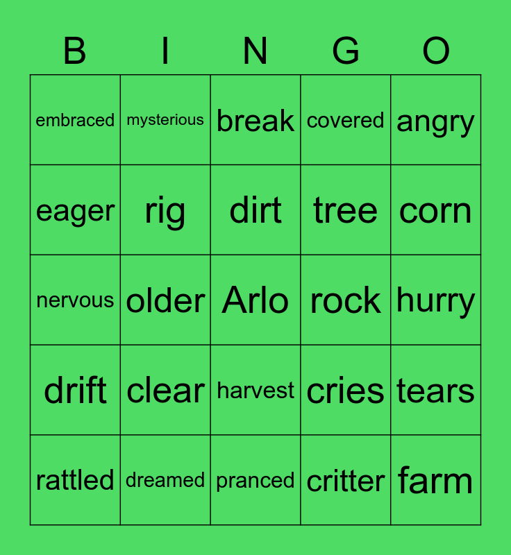 This bingo card has a free space and 104 words: after, air, angry, another, appeared, fear, arcs, are, frowned, around, berry, birds, born, boulder, brambles, brave, break, broke, brother, brushed, campfire, capture, care, chores, circle, clear, corn, covered, crashed, creature, cries, critter, curious, curled, current, darkness, dinosaur, determined, dirt, dreamed, drew, drift, dive, eager, earlier, embraced, familiar, farm, farther, group, figure, fireflies, free, friend, frightened, froze, grass, grew, grubby, harvest, hurry, herd, hurt, journey, killer, longhorns, mark, mysterious, nervous, older, pranced, protect, proud, rain, ran, rapids, raptors, rattled, reason, remembered, ridge, T. rexes, rig, river, rock, rose, sandbar, scared, sister, sorry, storm, stories, surge, tears, trail, tracks, trap, tree, understand, water, wilderness, winter, work and years.