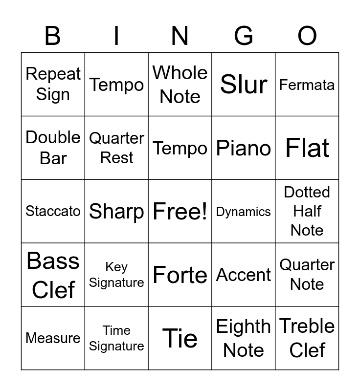 This bingo card has a free space and 24 words: Key Signature, Time Signature, Tempo, Measure, Fermata, Repeat Sign, Double Bar, Tempo, Dynamics, Forte, Piano, Staccato, Accent, Quarter Note, Quarter Rest, Eighth Note, Dotted Half Note, Whole Note, Flat, Sharp, Treble Clef, Bass Clef, Slur and Tie.