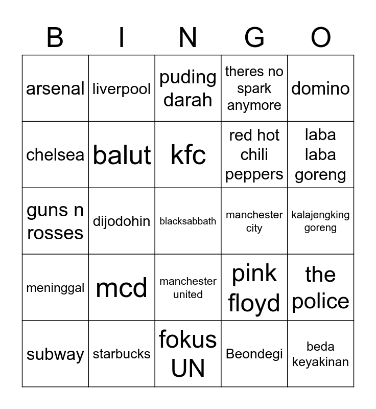 This bingo card has a free space and 24 words: mcd, starbucks, kfc, subway, domino, arsenal, chelsea, liverpool, manchester city, manchester united, red hot chili peppers, guns n rosses, pink floyd, the police, balut, Beondegi, kalajengking goreng, puding darah, laba laba goreng, dijodohin, beda keyakinan, meninggal, theres no spark anymore and fokus UN.