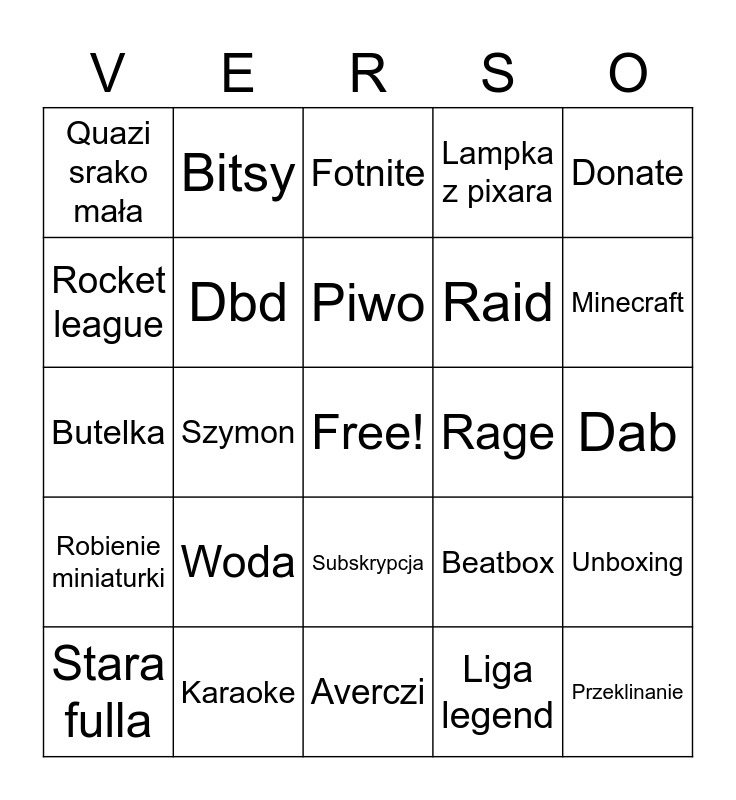 This bingo card has a free space and 24 words: Stara fulla, Woda, Piwo, Liga legend, Donate, Quazi srako mała, Bitsy, Fotnite, Rage, Dab, Butelka, Dbd, Beatbox, Unboxing, Rocket league, Karaoke, Averczi, Lampka z pixara, Minecraft, Robienie miniaturki, Szymon, Subskrypcja, Raid and Przeklinanie.