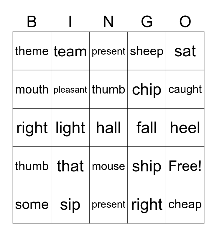 This bingo card has 51 words: caught, hall, some, present, that, thing, team, hill, mouth, sip, pleasant, sheep, Free!, ship, sing, heel, thumb, fall, cut, sat, light, right, theme, chip, mouse, cheap, caught, hall, some, present, that, thing, team, hill, mouth, sip, pleasant, sheep, ship, sing, heel, thumb, fall, cut, sat, light, right, theme, chip, mouse and cheap.