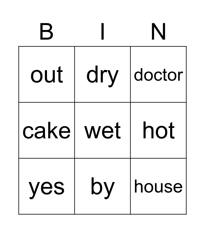 This bingo card has a free space and 13 words: bigger, off, yes, dry, cake, house, wheels, broken, by, out, hot, doctor and line.