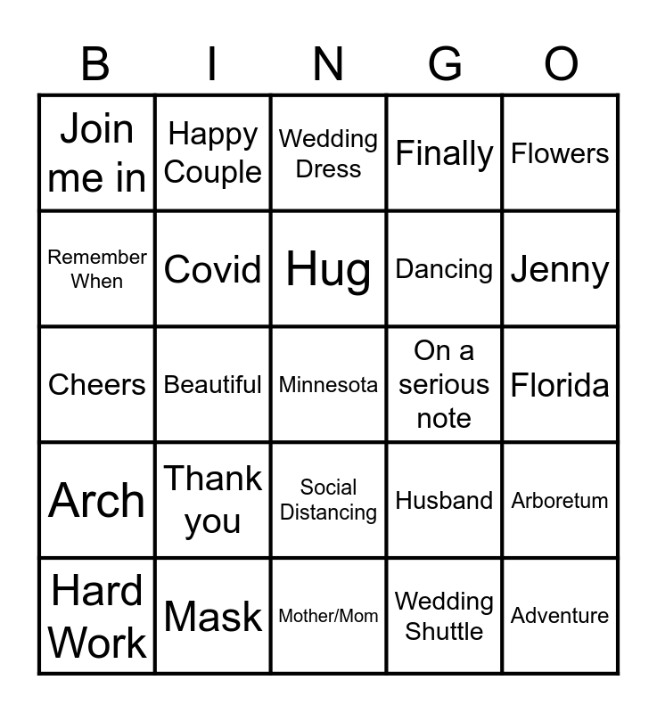 This bingo card has 40 words: Salud, Cheers, 2020, Covid, Mask, Social Distancing, Hug, Willow Tree, Flowers, Arch, Beautiful, Finally, Minnesota, Florida, On a serious note, Thank you, Raise a Glass, Join me in, Video/Computer Games, Wedding Dress, Arboretum, Wedding Shuttle, Dancing, Remember When, Love, Family, Bride, Groom, Adventure, Blessing, Happy, Hard Work, Wife, Husband, Jenny, Mother/Mom, Travel, Enjoy, Happy Couple and It's About Time.