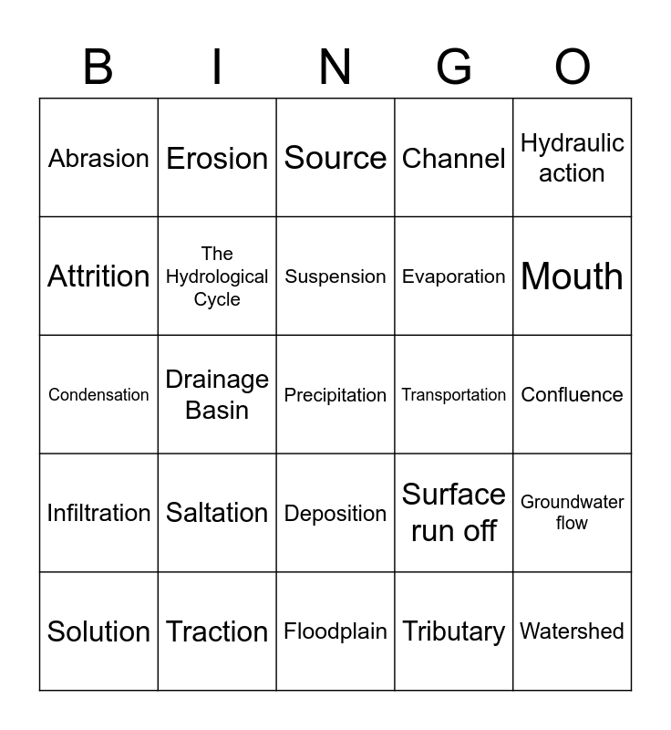 This bingo card has a free space and 24 words: Saltation, Traction, Suspension, Solution, Hydraulic action, Abrasion, Attrition, Erosion, Transportation, Deposition, Evaporation, Condensation, Surface run off, Groundwater flow, The Hydrological Cycle, Tributary, Confluence, Source, Mouth, Drainage Basin, Watershed, Infiltration, Channel and Floodplain.