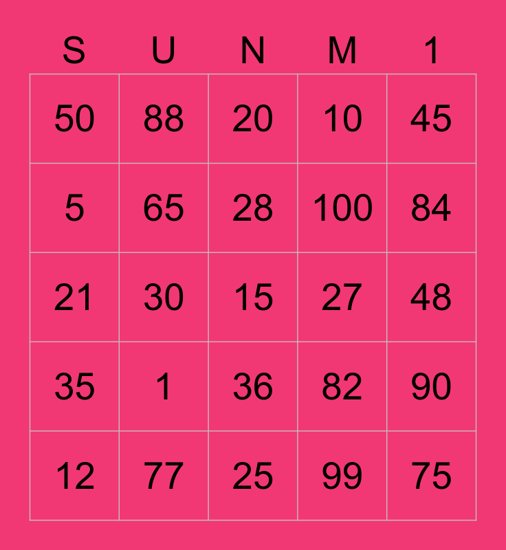 This bingo card has a free space and 24 words: 1, 77, 28, 12, 45, 50, 5, 88, 27, 36, 100, 21, 82, 90, 65, 99, 48, 20, 84, 30, 75, 35, 10 and 25.