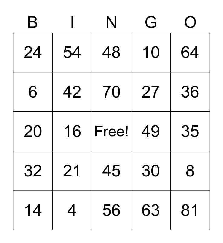 This bingo card has a free space and 30 words: 4, 12, 16, 18, 24, 48, 42, 45, 49, 56, 35, 81, 63, 72, 36, 28, 30, 32, 21, 64, 20, 40, 54, 27, 6, 10, 8, 14, 70 and 25.