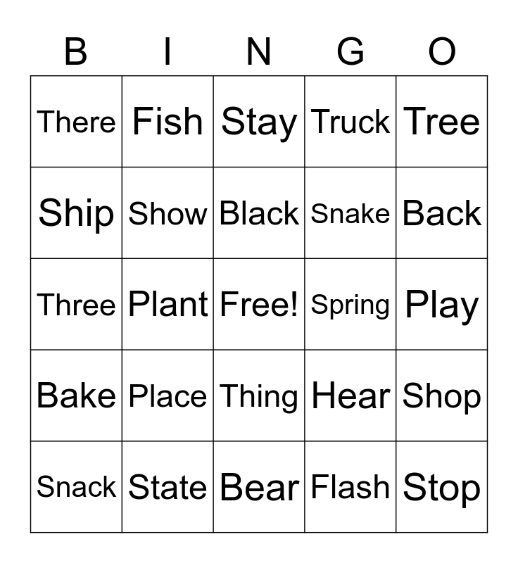 This bingo card has a free space and 24 words: Place, State, Black, Snack, Tree, There, Ship, Fish, Spring, Thing, Snake, Three, Hear, Shop, Show, Flash, Play, Stay, Back, Plant, Stop, Bake, Truck and Bear.