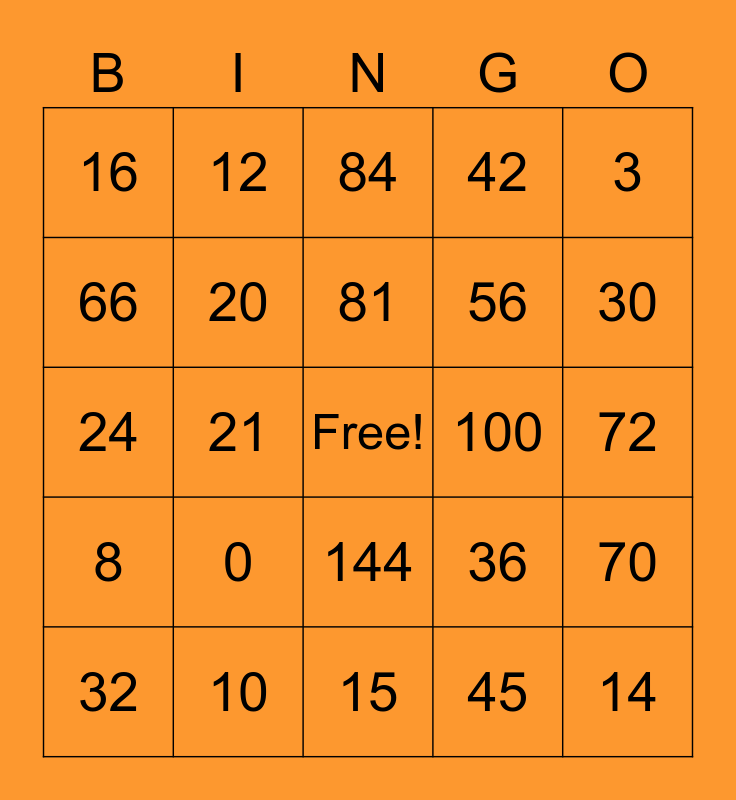 This bingo card has a free space and 24 words: 0, 10, 81, 32, 3, 16, 66, 12, 100, 144, 56, 24, 36, 70, 20, 45, 72, 84, 30, 21, 14, 8, 42 and 15.