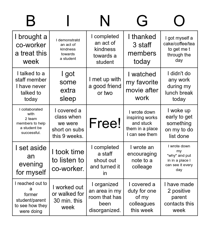 This bingo card has a free space and 24 words: I took time to listen to co-worker., I worked out or walked for 30 min. this week, I met up with a good friend or two, I reached out to a former student/parent to see how they were doing, I got myself a cake/coffee/tea to get me t through the day, I brought a co-worker a treat this week, I talked to a staff member I have never talked to today, I demonstratd an act of kindness towards a student, I wrote down inspiring works and stuck them in a place I can see them, I completed a staff shout out and turned it in, I watched my favorite movie after work, I collaborated with 2 team members to help a student be successful., I wrote an encouraging note to a colleage, I wrote down my "why" and put in in a place I can see it every day, I got some extra sleep, I covered a duty for one of my colleagues this week, I woke up early to get something on my to do list done, I completed an act of kindness towards a student, I didn't do any work during my lunch break today, I covered a class when we were short on subs this 9 weeks., I have made 2 positive parent contacts this week, I set aside an evening for myself, I thanked 3 staff members today and I organized an area in my room that has been disorganized..