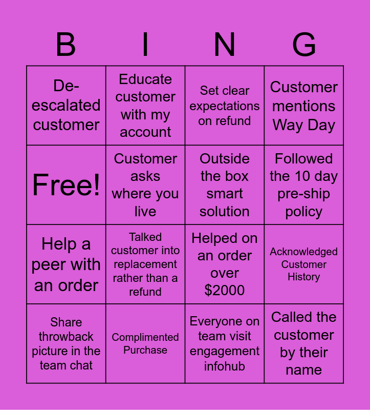 This bingo card has 16 words: Complimented Purchase, Acknowledged Customer History, Set clear expectations on refund, De-escalated customer, Help a peer with an order, Educate customer with my account, Helped on an order over $2000, Everyone on team visit engagement infohub, Free!, Customer asks where you live, Share throwback picture in the team chat, Customer mentions Way Day, Talked customer into replacement rather than a refund, Followed the 10 day pre-ship policy, Outside the box smart solution and Called the customer by their name.