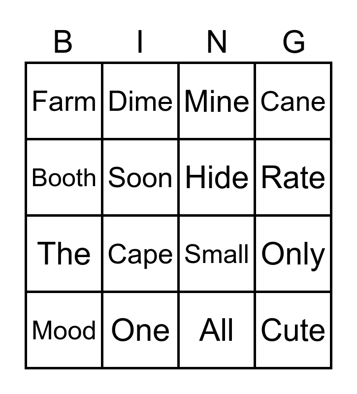 This bingo card has 16 words: One, Only, Mine, Farm, The, Dime, Small, All, Booth, Soon, Mood, Cane, Cape, Rate, Hide and Cute.
