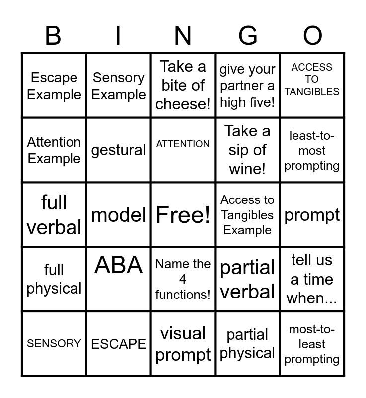 This bingo card has a free space and 24 words: ABA, ESCAPE, ATTENTION, SENSORY, ACCESS TO TANGIBLES, Escape Example, Attention Example, Sensory Example, Access to Tangibles Example, Name the 4 functions!, Take a sip of wine!, full verbal, partial verbal, tell us a time when..., gestural, partial physical, prompt, Take a bite of cheese!, least-to-most prompting, model, most-to-least prompting, full physical, give your partner a high five! and visual prompt.