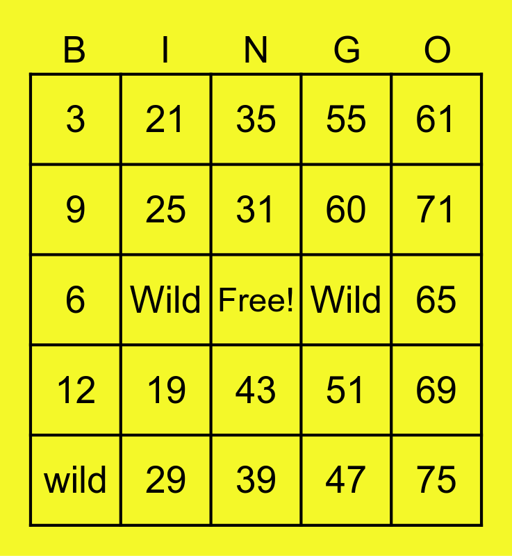 This bingo card has a free space and 24 words: wild, 19, 31, 47, 61, 3, 21, 35, Wild, 65, 6, 25, 51, 69, 9, 29, 39, 55, 71, 12, Wild, 43, 60 and 75.