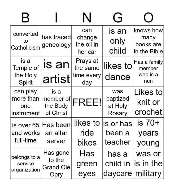 This bingo card has a free space and 24 words: Has been an altar server, Has gone to the Grand Ole Opry, Prays at the same time every day, belongs to a service organization, knows how many books are in the Bible, converted to Catholicism, is a Temple of the Holy Spirit, has traced geneology, was baptized at Holy Rosary, likes to ride bikes, likes to dance, can play more than one instrument, is or has been a teacher, is 70+ years young, is an artist, has a child in daycare, Likes to knit or crochet, can change the oil in her car, Has a family member who is a nun, is a member of the Body of Christ, was or is in the military, is over 65 and works full-time, is an only child and Has green eyes.