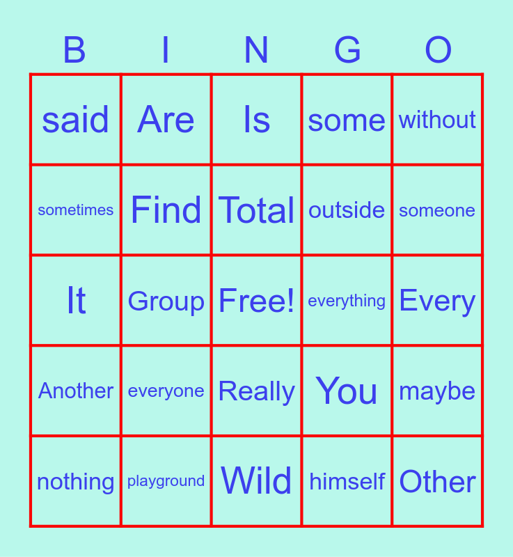 This bingo card has a free space and 24 words: everyone, playground, Total, nothing, without, said, sometimes, Are, everything, Really, outside, It, You, maybe, Find, himself, Every, Is, someone, Group, Other, Another, some and Wild.