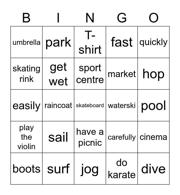 This bingo card has a free space and 29 words: boots, shorts, raincoat, sandals, umbrella, T-shirt, get wet, sail, waterski, surf, pool, dive, jog, do karate, hop, skip, have a picnic, play the violin, quickly, easily, carefully, well, market, skating rink, fast, park, cinema, sport centre and beautifully.