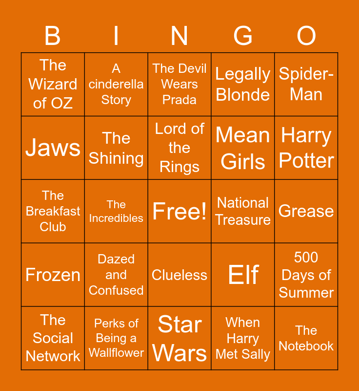 This bingo card has a free space and 57 words: Finding Nemo, The Social Network, The Dark Knight, The Wizard of OZ, Star Wars, Forrest Gump, The Shining, Titantic, Mean Girls, Mulan, Legally Blonde, Shrek, Uncut Gems, Guardians of the Galaxy, Napoleon Dynamite, Hunger Games, Spider-Man, The Incredibles, Zoolander, The Notebook, National Treasure, Captain Phillips, Elf, The Devil Wears Prada, Dodgeball, Lord of the Rings, 300, 13 Going on 30, Harry Potter, The Spongebob Squarepants Movie, Scott Pilgrim Vs. The World, Pirates of the Caribbean, A Star is Born, The Sixth Sense, Grease, Jaws, High School Musical, The Breakfast Club, Twilight, Frozen, A cinderella Story, Clueless, Scarface, Step Brothers, The Great Gatsby, Up, Dazed and Confused, Perks of Being a Wallflower, Apollo 13, The Help, Spiderman, When Harry Met Sally, Encanto, Fault in Our Stars, Toy Story, 500 Days of Summer and Promising Young Woman.
