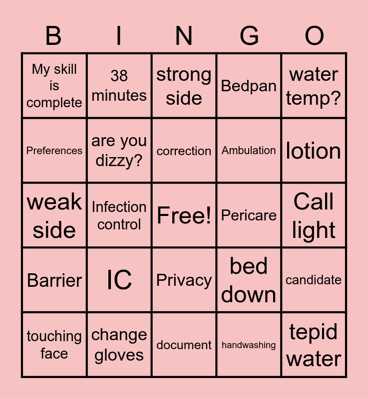This bingo card has a free space and 24 words: IC, change gloves, correction, touching face, water temp?, My skill is complete, Preferences, 38 minutes, Pericare, Privacy, Ambulation, weak side, bed down, candidate, are you dizzy?, handwashing, Call light, strong side, lotion, Infection control, tepid water, Barrier, Bedpan and document.