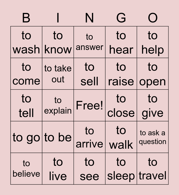 This bingo card has a free space and 24 words: to be, to live, to sell, to believe, to help, to wash, to come, to know, to close, to arrive, to raise, to tell, to walk, to ask a question, to take out, to sleep, to give, to answer, to open, to explain, to travel, to go, to hear and to see.