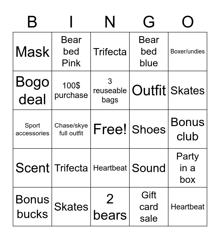 This bingo card has a free space and 24 words: Trifecta, Skates, 3 reuseable bags, Bonus bucks, Boxer/undies, Mask, Bogo deal, Bear bed Pink, Shoes, Heartbeat, Outfit, Sport accessories, Sound, Party in a box, 100$ purchase, Gift card sale, Bonus club, Trifecta, Skates, Chase/skye full outfit, Heartbeat, Scent, Bear bed blue and 2 bears.