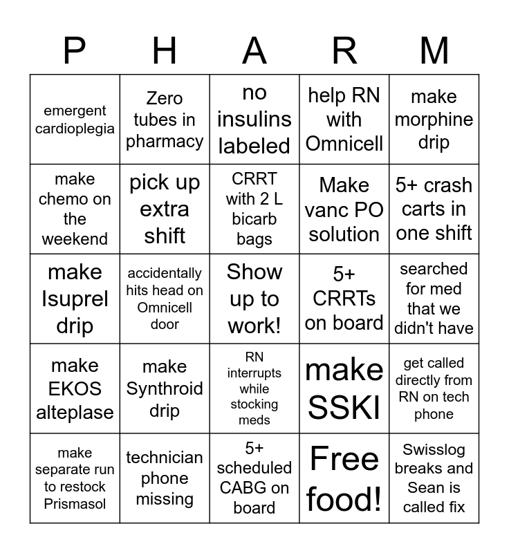 This bingo card has a free space and 30 words: technician phone missing, table full of pre-pack medications, accidentally hits head on Omnicell door, IMC2 opens and meds have to be stocked, emergent cardioplegia, no insulins labeled, pick up extra shift, RN interrupts while stocking meds, 5+ CRRTs on board, 5+ scheduled CABG on board, searched for med that we didn't have, Swisslog breaks and Sean is called fix, Free food!, Medkeeper down, 5+ crash carts in one shift, make triple mix, make SSKI, make EKOS alteplase, make Synthroid drip, make morphine drip, make Isuprel drip, Tube station goes down, Zero tubes in pharmacy, Make vanc PO solution, make chemo on the weekend, help RN with Omnicell, get called directly from RN on tech phone, make separate run to restock Prismasol, CRRT with 2 L bicarb bags and make Vitamin K suspension.