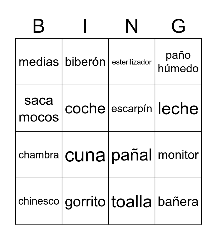 This bingo card has 20 words: monitor, cambiador, esterilizador, pañalera, chinesco, saca mocos, gorrito, medias, chambra, biberón, cuna, pañal, coche, bañera, escarpín, manta, leche, paño húmedo, toalla and chupón.