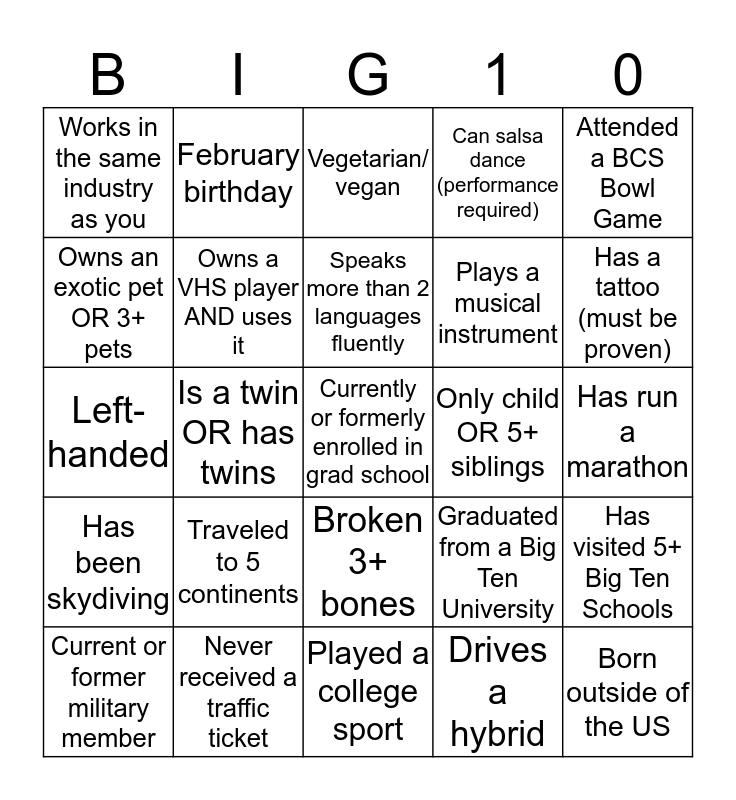 This bingo card has 25 words: Traveled to 5 continents, Played a college sport, Speaks more than 2 languages fluently, Current or former military member, Attended a BCS Bowl Game, Works in the same industry as you, Owns an exotic pet OR 3+ pets, February birthday, Only child OR 5+ siblings, Broken 3+ bones, Plays a musical instrument, Left-handed, Graduated from a Big Ten University, Has visited 5+ Big Ten Schools, Owns a VHS player AND uses it, Born outside of the US, Has run a marathon, Vegetarian/ vegan, Has a tattoo (must be proven), Is a twin OR has twins, Currently or formerly enrolled in grad school, Never received a traffic ticket, Has been skydiving, Can salsa dance (performance required) and Drives a hybrid.