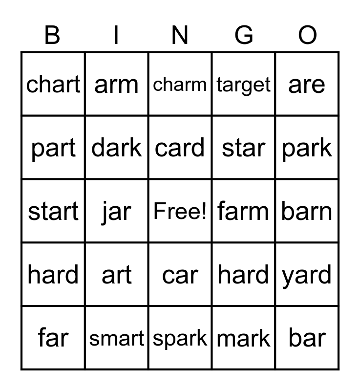 This bingo card has a free space and 24 words: art, smart, card, far, are, chart, part, arm, farm, car, star, start, hard, yard, dark, mark, barn, charm, park, jar, bar, hard, target and spark.