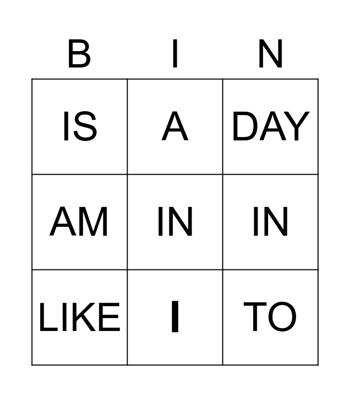 This bingo card has a free space and 10 words: I, DAY, IS, TO, AM, LIKE, A, THE, IN and IT.