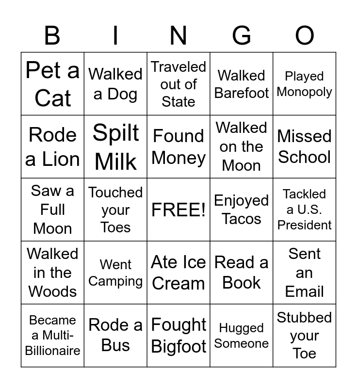 This bingo card has a free space and 24 words: Went Camping, Rode a Bus, Found Money, Became a Multi- Billionaire, Played Monopoly, Pet a Cat, Rode a Lion, Walked a Dog, Enjoyed Tacos, Ate Ice Cream, Walked on the Moon, Saw a Full Moon, Read a Book, Sent an Email, Spilt Milk, Hugged Someone, Tackled a U.S. President, Traveled out of State, Missed School, Touched your Toes, Stubbed your Toe, Walked in the Woods, Walked Barefoot and Fought Bigfoot.