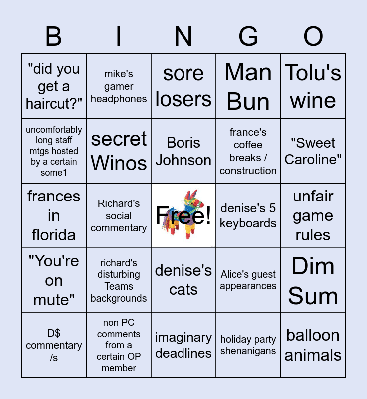 This bingo card has a free space and 24 words: richard's disturbing Teams backgrounds, non PC comments from a certain OP member, Boris Johnson, D$ commentary /s, Tolu's wine, "did you get a haircut?", uncomfortably long staff mtgs hosted by a certain some1, mike's gamer headphones, denise's 5 keyboards, denise's cats, france's coffee breaks / construction, frances in florida, Alice's guest appearances, Dim Sum, secret Winos, holiday party shenanigans, unfair game rules, sore losers, "Sweet Caroline", Richard's social commentary, balloon animals, "You're on mute", Man Bun and imaginary deadlines.