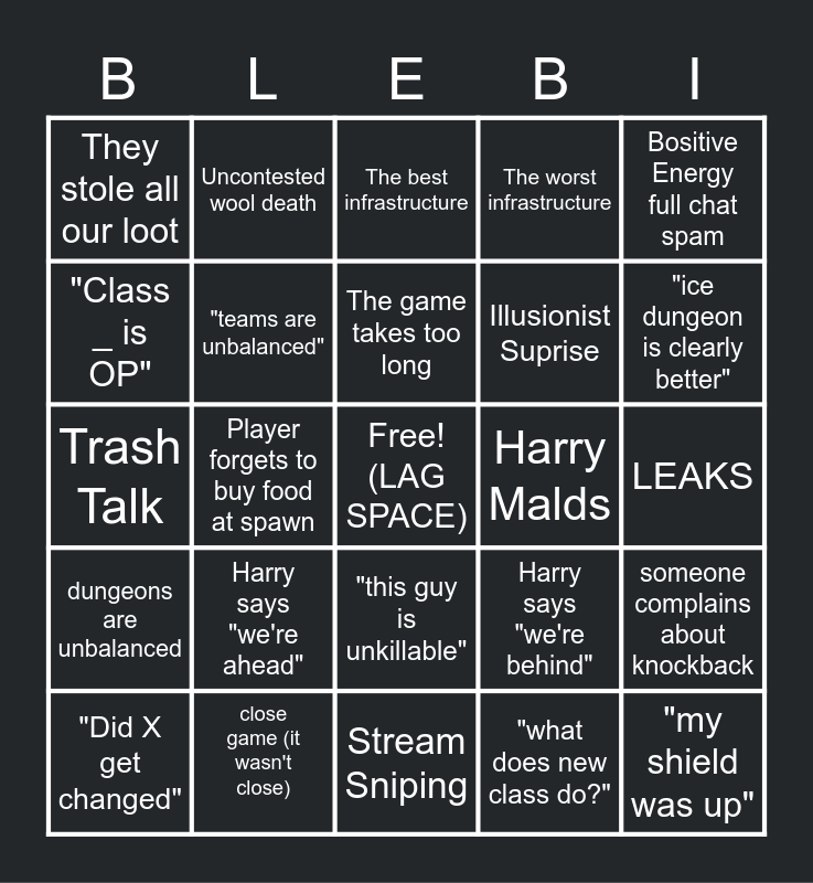 This bingo card has a free space and 24 words: Harry says "we're ahead", close game (it wasn't close), The game takes too long, "Did X get changed", Bositive Energy full chat spam, They stole all our loot, "Class _ is OP", Uncontested wool death, Harry Malds, "this guy is unkillable", Illusionist Suprise, Trash Talk, Harry says "we're behind", someone complains about knockback, "teams are unbalanced", "what does new class do?", LEAKS, The best infrastructure, "ice dungeon is clearly better", Player forgets to buy food at spawn, "my shield was up", dungeons are unbalanced, The worst infrastructure and Stream Sniping.