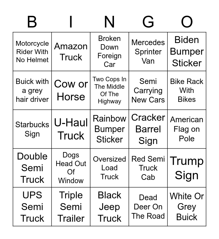 This bingo card has 26 words: Oversized Load Truck, Dead Deer On The Road, Two Cops In The Middle Of The Highway, Triple Semi Trailer, Biden Bumper Sticker, Motorcycle Rider With No Helmet, Buick with a grey hair driver, Amazon Truck, American Flag on Pole, Red Semi Truck Cab, Semi Carrying New Cars, Starbucks Sign, Trump Sign, UPS Semi Truck, U-Haul Truck, Dirtbike or ATV, Mercedes Sprinter Van, Double Semi Truck, Broken Down Foreign Car, Rainbow Bumper Sticker, Bike Rack With Bikes, Black Jeep Truck, Cracker Barrel Sign, Dogs Head Out Of Window, Cow or Horse and White Or Grey Buick.