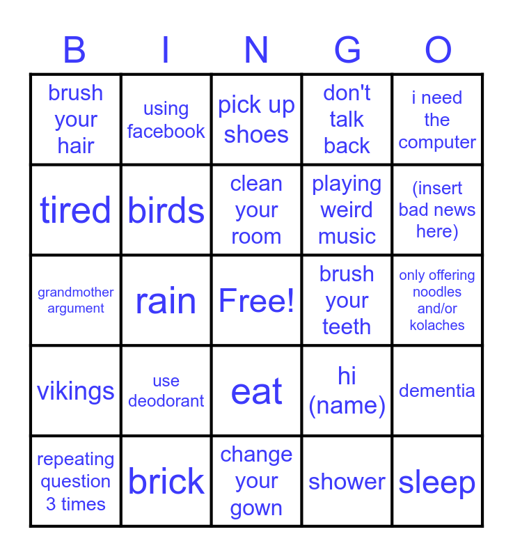 This bingo card has a free space and 35 words: turn off/down the tv, school, dog going outside, birds, eat, don't talk back, tired, movie, clean your room, college, grandmother argument, i need the computer, are you working, wash your hands, brush your hair, brush your teeth, shower, rain, vikings, sleep, hi (name), repeating question 3 times, dementia, brick, pick up shoes, (insert bad news here), life story, singing, playing weird music, only offering noodles and/or kolaches, change your underwear, change your gown, use deodorant, using facebook and boomer mistake.