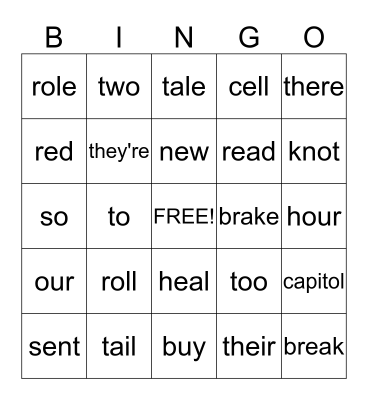 This bingo card has a free space and 52 words: capital, break, sighed, buy, roll, by, two, knew, red, side, they're, sight, capitol, too, site, bye, new, brake, plain, there, to, their, role, read, plane, bored, board, not, knot, waist, waste, cell, sell, flour, flower, tale, tail, some, sum, scene, seen, hour, our, heel, heal, he'll, sew, so, sow, cent, sent and scent.
