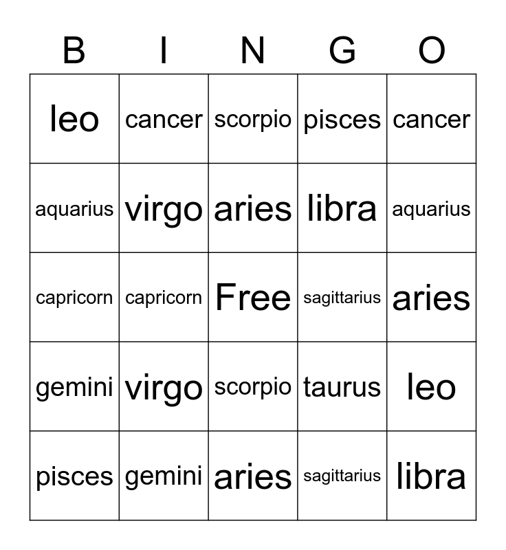 This bingo card has a free space and 24 words: virgo, gemini, aries, pisces, cancer, leo, aquarius, cancer, sagittarius, scorpio, libra, capricorn, taurus, leo, virgo, sagittarius, aries, scorpio, aquarius, capricorn, libra, gemini, pisces and aries.