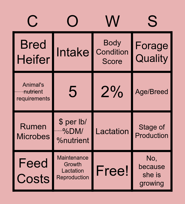 This bingo card has 2 images and 19 words: Lactation, Dry matter, Body Condition Score, No, because she is growing, Stage of Production, Animal's nutrient requirements, Free!, Bred Heifer, Intake, Rumen Microbes, $ per lb/ %DM/ %nutrient, 5, 2%, Maintenance Growth Lactation Reproduction, Feed Costs, Don't guess, forage test!, Forage Quality, Age/Breed and Environment.