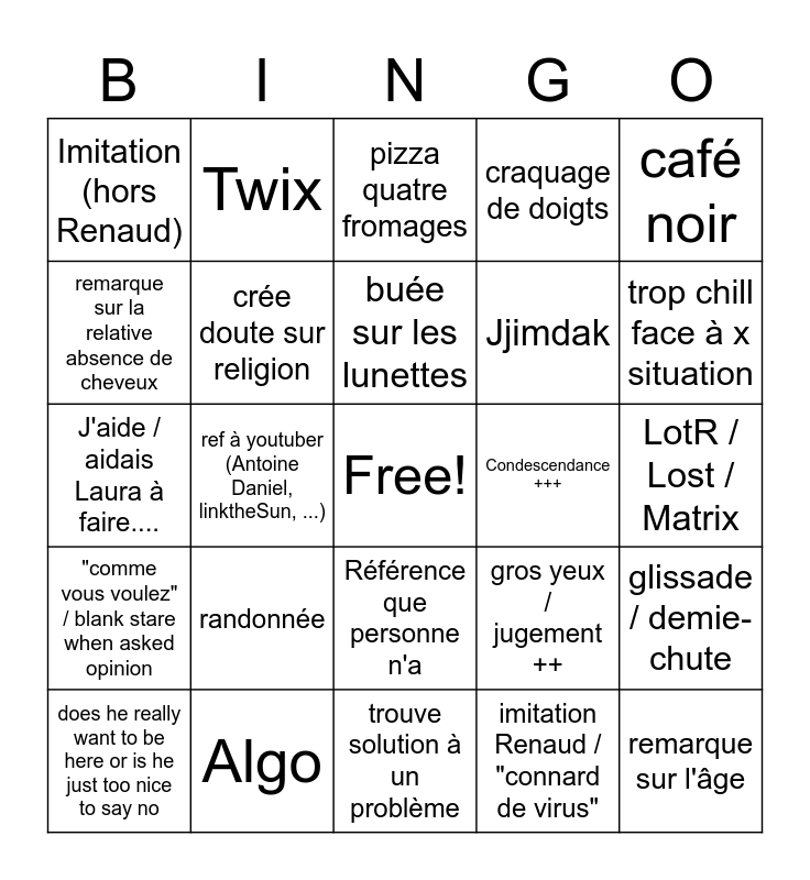 This bingo card has a free space and 24 words: randonnée, Algo, buée sur les lunettes, does he really want to be here or is he just too nice to say no, café noir, Imitation (hors Renaud), remarque sur la relative absence de cheveux, Twix, Condescendance +++, Référence que personne n'a, Jjimdak, J'aide / aidais Laura à faire...., gros yeux / jugement ++, glissade / demie-chute, crée doute sur religion, imitation Renaud / "connard de virus", LotR / Lost / Matrix, pizza quatre fromages, trop chill face à x situation, ref à youtuber (Antoine Daniel, linktheSun, ...), remarque sur l'âge, "comme vous voulez" / blank stare when asked opinion, craquage de doigts and trouve solution à un problème.