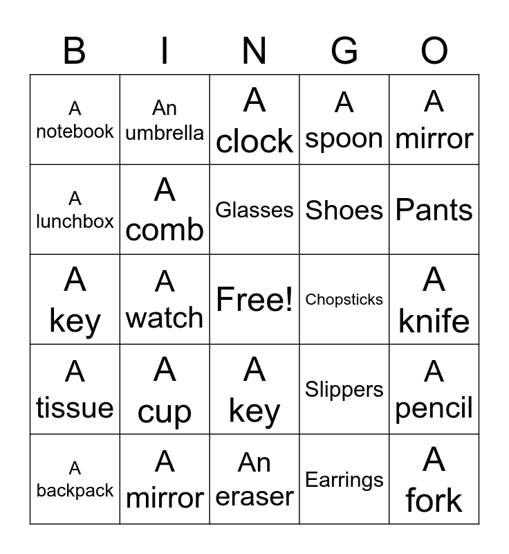 This bingo card has a free space and 41 words: A computer, A key, Glasses, A comb, A mirror, A key, Glasses, A comb, A mirror, A tissue, A watch, A spoon, A fork, A knife, Chopsticks, A cup, A computer, A notebook, A book, A clock, A pencil, A pen, An eraser, Shoes, Socks, A ring, Earrings, A necklace, Pants, A shirt, A jacket, An umbrella, A backpack, A fan, Slippers, A lunchbox, A stapler, A file, A laptop, A workbook and A student book.