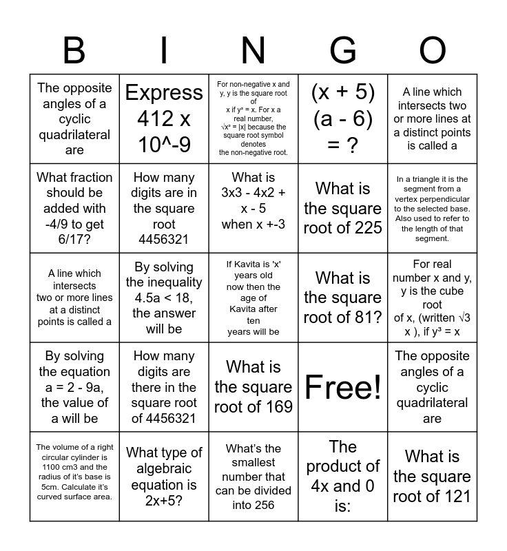 This bingo card has 25 words: How many digits are there in the square root of 4456321, What’s the smallest number that can be divided into 256, What is 3x3 - 4x2 + x - 5 when x +-3, The volume of a right circular cylinder is 1100 cm3 and the radius of it’s base is 5cm. Calculate it’s curved surface area., A line which intersects two or more lines at a distinct points is called a, The opposite angles of a cyclic quadrilateral are, What fraction should be added with -4/9 to get 6/17?, Express 412 x 10^-9, What is the square root of 81?, What is the square root of 169, What is the square root of 225, A line which intersects two or more lines at a distinct points is called a, Free!, The opposite angles of a cyclic quadrilateral are, How many digits are in the square root 4456321, What is the square root of 121, For real number x and y, y is the cube root of x, (written √3 x ), if y³ = x, For non-negative x and y, y is the square root of x if y² = x. For x a real number, √x² = |x| because the square root symbol denotes the non-negative root., In a triangle it is the segment from a vertex perpendicular to the selected base. Also used to refer to the length of that segment., By solving the inequality 4.5a < 18, the answer will be, If Kavita is 'x' years old now then the age of Kavita after ten years will be, What type of algebraic equation is 2x+5?, By solving the equation a = 2 - 9a, the value of a will be, (x + 5)(a - 6) = ? and The product of 4x and 0 is:.
