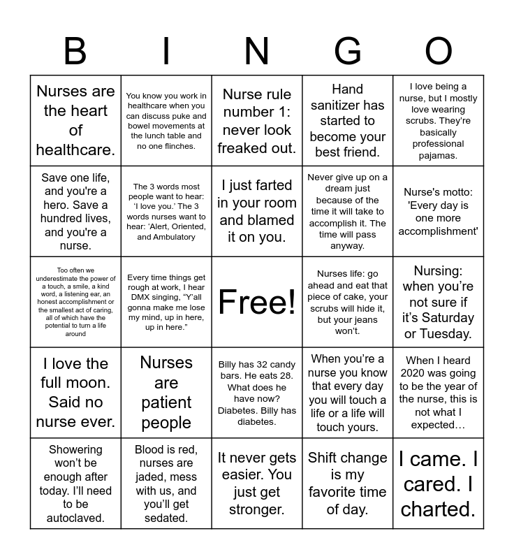 This bingo card has a free space and 24 words: Nurses are patient people, Blood is red, nurses are jaded, mess with us, and you’ll get sedated., I just farted in your room and blamed it on you., Showering won’t be enough after today. I’ll need to be autoclaved., I love being a nurse, but I mostly love wearing scrubs. They’re basically professional pajamas., Nurses are the heart of healthcare., Save one life, and you're a hero. Save a hundred lives, and you're a nurse., You know you work in healthcare when you can discuss puke and bowel movements at the lunch table and no one flinches., Nurses life: go ahead and eat that piece of cake, your scrubs will hide it, but your jeans won’t., Billy has 32 candy bars. He eats 28. What does he have now? Diabetes. Billy has diabetes., Never give up on a dream just because of the time it will take to accomplish it. The time will pass anyway., Too often we underestimate the power of a touch, a smile, a kind word, a listening ear, an honest accomplishment or the smallest act of caring, all of which have the potential to turn a life around, When you’re a nurse you know that every day you will touch a life or a life will touch yours., When I heard 2020 was going to be the year of the nurse, this is not what I expected…, The 3 words most people want to hear: ‘I love you.’ The 3 words nurses want to hear: ‘Alert, Oriented, and Ambulatory, Shift change is my favorite time of day., Nursing: when you’re not sure if it’s Saturday or Tuesday., Nurse rule number 1: never look freaked out., Nurse's motto: 'Every day is one more accomplishment', Every time things get rough at work, I hear DMX singing, “Y’all gonna make me lose my mind, up in here, up in here.”, I came. I cared. I charted., I love the full moon. Said no nurse ever., Hand sanitizer has started to become your best friend. and It never gets easier. You just get stronger..