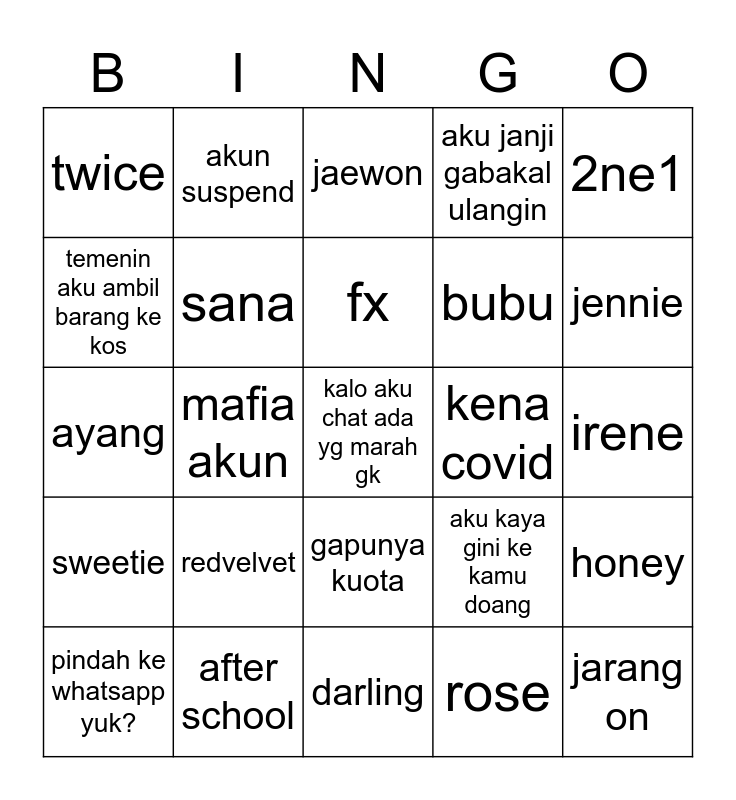 This bingo card has a free space and 24 words: redvelvet, after school, fx, pindah ke whatsapp yuk?, 2ne1, twice, temenin aku ambil barang ke kos, akun suspend, kena covid, gapunya kuota, bubu, ayang, aku kaya gini ke kamu doang, honey, sana, rose, irene, jaewon, jennie, mafia akun, jarang on, sweetie, aku janji gabakal ulangin and darling.