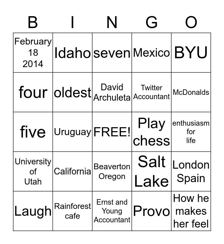 This bingo card has a free space and 24 words: California, Rainforest cafe, David Archuleta, Laugh, BYU, February 18 2014, four, Idaho, Play chess, Beaverton Oregon, Twitter Accountant, five, Salt Lake, London Spain, oldest, Provo, enthusiasm for life, seven, McDonalds, Uruguay, How he makes her feel, University of Utah, Mexico and Ernst and Young Accountant.