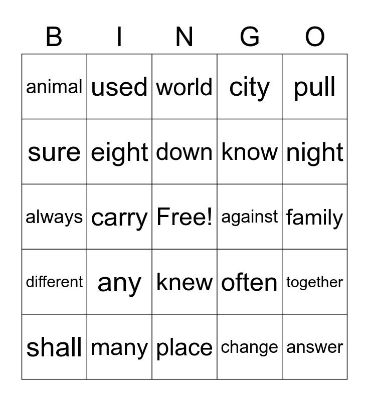 This bingo card has a free space and 24 words: any, many, down, shall, pull, animal, sure, used, against, knew, know, always, often, together, eight, change, family, world, night, carry, answer, different, city and place.