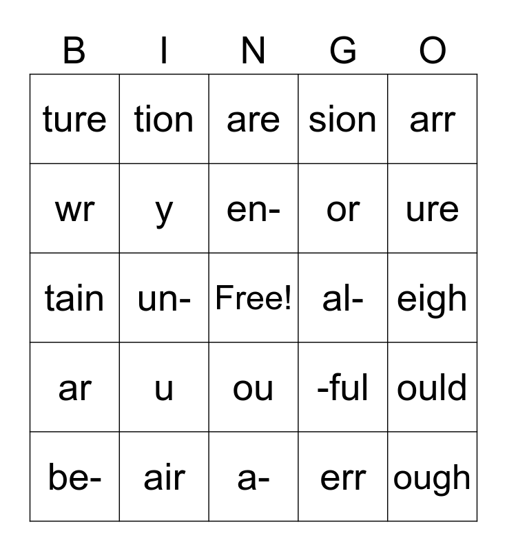 This bingo card has a free space and 27 words: -ful, war, or, a-, wr, are, tion, ar, al-, ould, tain, sion, be-, air, ure, sion, y, en-, u, ture, eigh, err, un-, ough, ou, arr and ire.