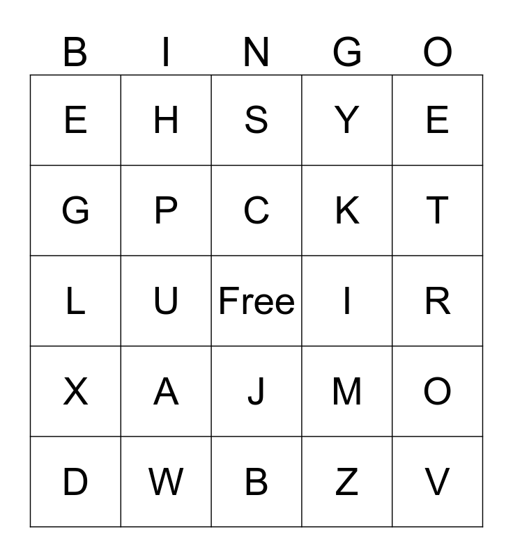 This bingo card has a free space and 25 words: A, B, C, D, E, E, G, H, I, J, K, L, M, O, P, Q, R, S, T, U, V, W, X, Y and Z.