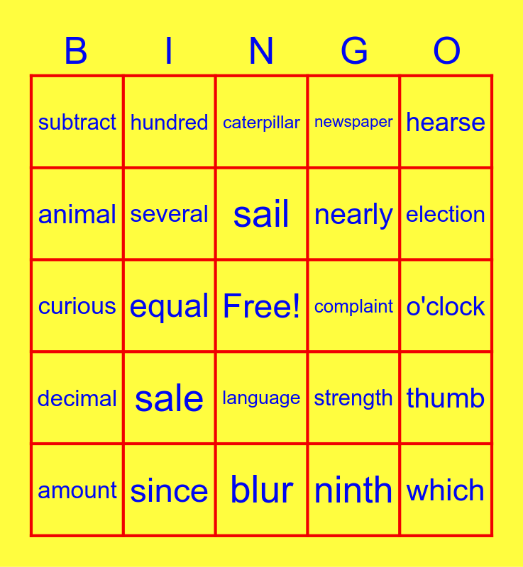 This bingo card has a free space and 24 words: sale, since, sail, amount, hearse, subtract, animal, hundred, complaint, language, nearly, curious, strength, thumb, several, ninth, o'clock, caterpillar, election, equal, which, decimal, newspaper and blur.