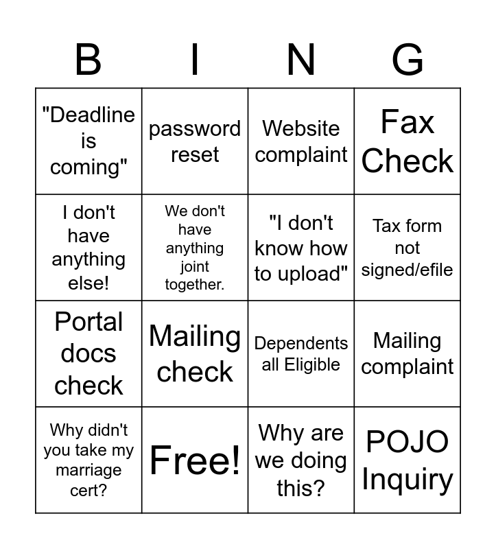 This bingo card has 16 words: Free!, Mailing complaint, Website complaint, "Deadline is coming", Portal docs check, password reset, Dependents all Eligible, Why are we doing this?, I don't have anything else!, We don't have anything joint together., Why didn't you take my marriage cert?, Fax Check, Mailing check, Tax form not signed/efile, "I don't know how to upload" and POJO Inquiry.